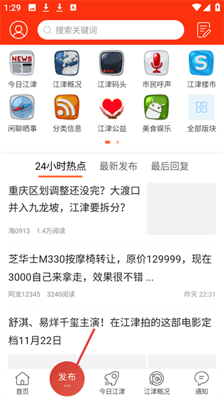 2、江津論壇頁有今日江津等入口,展示24小時熱點帖子,可發布內容參與討論,了解本地最新動態。