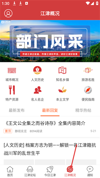4、江津概況頁有城市概況等入口,含知名鄉鎮等分類,還有最新回復等板塊,介紹江津人文、地理及特產資源。