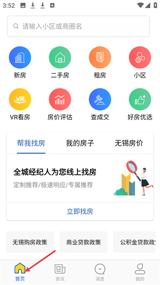 2、首頁功能入口有新房、二手房等,提供VR看房、房價評估等服務,可讓經紀人線上找房,還能查看無錫購房政策。