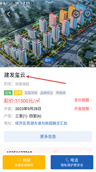 4、建發璽云悅喜瑞園房源頁,在售帶裝修花園洋房,起價31500元,2023年9月開盤,有三室、四室戶型,可微聊或電話咨詢。