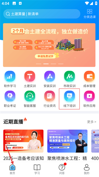 1、首頁,含軟件學習等功能入口,推2個月土建全流程課程,設近期直播板塊,提供造價學習資源,助力從業者提升技能。