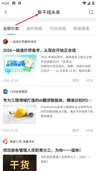 2、全部分類,展示造價師備考等資訊,內容聚焦工程領域,涵蓋考試、工具等信息,為從業者提供行業動態與實用內容。