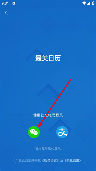 3、登錄界面可選擇使用社交帳號登錄,有微信、支付寶兩種登錄方式,也可選擇使用帳號密碼登錄,登錄前需閱讀并同意服務協議及隱私政策。