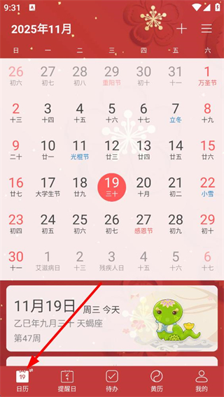 1、進入日歷界面,可查看2025年11月的日期,包含重陽節、立冬等節日節氣,下方有日歷、提醒日等功能入口,能便捷查看和管理日期信息。