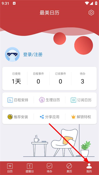 2、點擊我的可進入個人中心,該頁面有登錄、注冊入口,還能查看已使用天數、日程事件等數據,以及日程安排、生理日歷等功能選項。