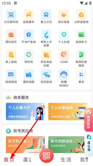 1、進入App首頁,有公交乘車碼、自助挪車、公積金查詢等眾多功能入口,還有政務服務板塊的個人辦事大廳、辦事指南。