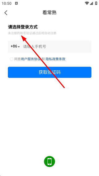 3、登錄界面,選擇輸入手機號,勾選同意用戶服務協議和隱私政策條款,點擊獲取驗證碼,未注冊賬號驗證通過后自動注冊,完成登錄操作。