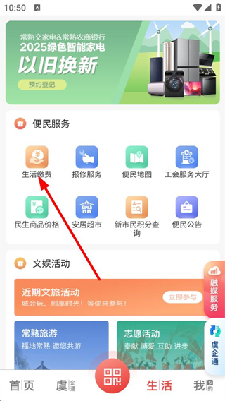 4、點擊底部生活,有便民服務板塊的生活繳費、報修服務等,文娛活動板塊的近期文旅活動、常熟旅游、志愿活動等,可辦理生活繳費。