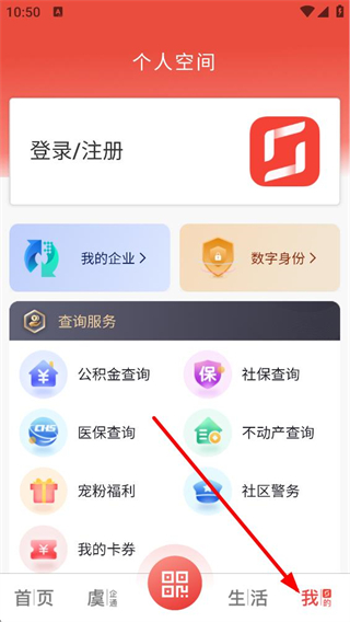 2、點擊底部我的,進入個人空間,可進行登錄、注冊,有我的企業、數字身份功能,查詢服務板塊可查公積金、社保、醫保等。