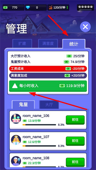 4、在管理界面切換到統計選項,能查看大廳和鬼屋的預計收入、工資成本等數據,還可點擊前往按鈕查看各區域詳情,輔助經營決策。