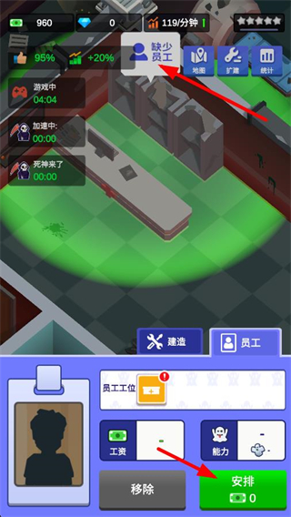 1、界面提示缺少員工,打開員工界面,在員工工位處點擊安排按鈕,可補充員工,滿足經營所需的人員配置。