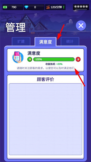 3、打開管理界面選擇滿意度選項,可查看當前滿意度數值及收益加成,需關注顧客需求及時滿足,以此維持或提升滿意度,保障收益加成。