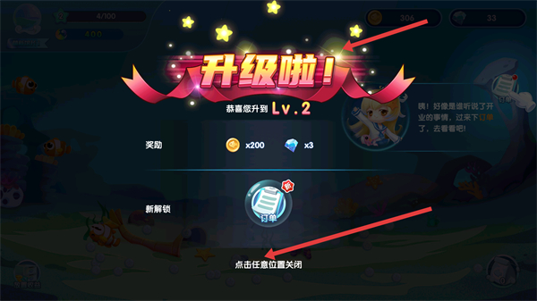3、隨著游戲進行會升級,升級后能獲得獎勵,還會解鎖新內容,點擊任意位置可關閉升級提示界面。