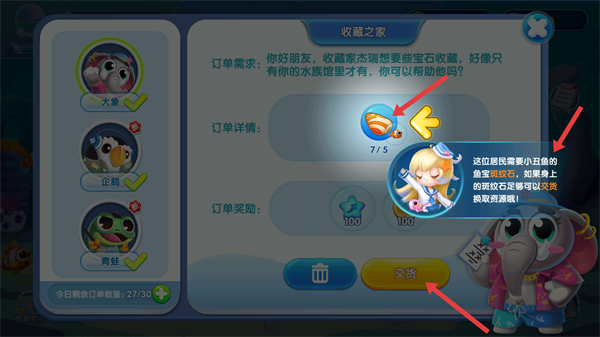 4、會接到訂單任務,根據訂單需求,用水族館里的物品進行交貨,完成后可獲得訂單獎勵,提升游戲進度。