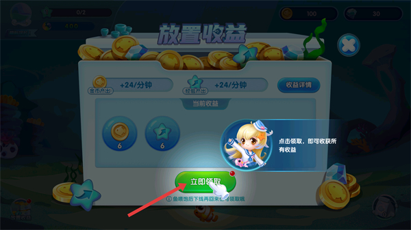 2、有放置收益功能,可點擊立即領取,獲取金幣、經驗等收益,積累資源用于水族館的發展。