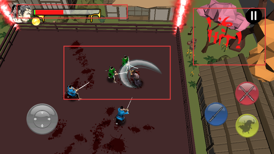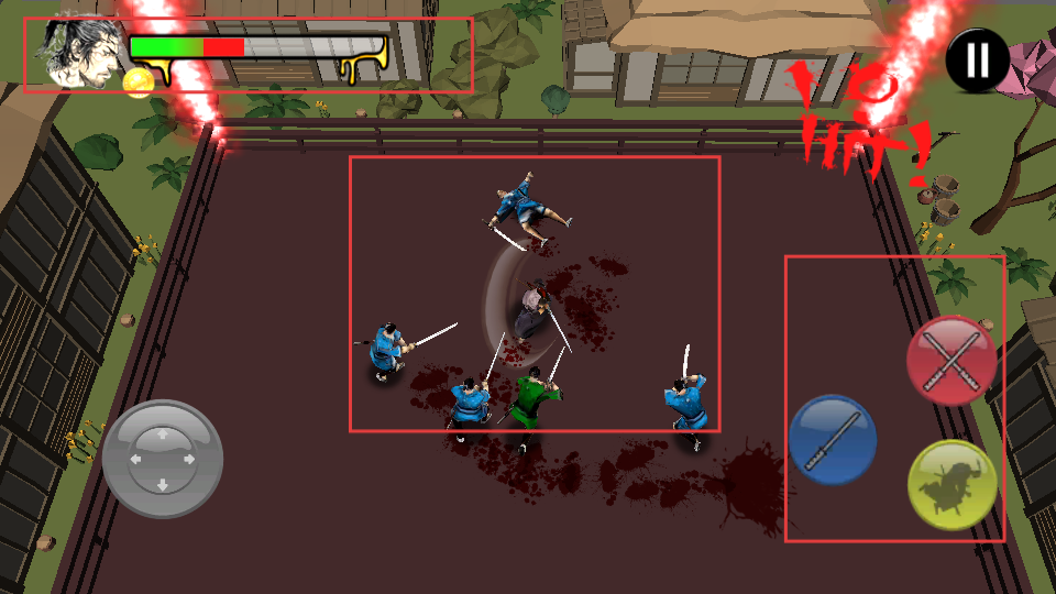 2、在戰斗場景,操控武士與敵人交鋒,利用右側攻擊按鈕發動攻擊,注意上方生命值,合理戰斗避免生命值耗盡。