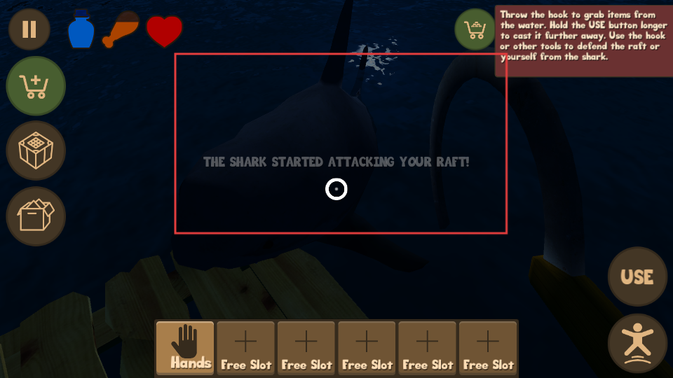 3、游戲中會有鯊魚攻擊木筏的情況,此時要利用鉤子或其他工具,抵御鯊魚的進攻,保護木筏和自身安全。