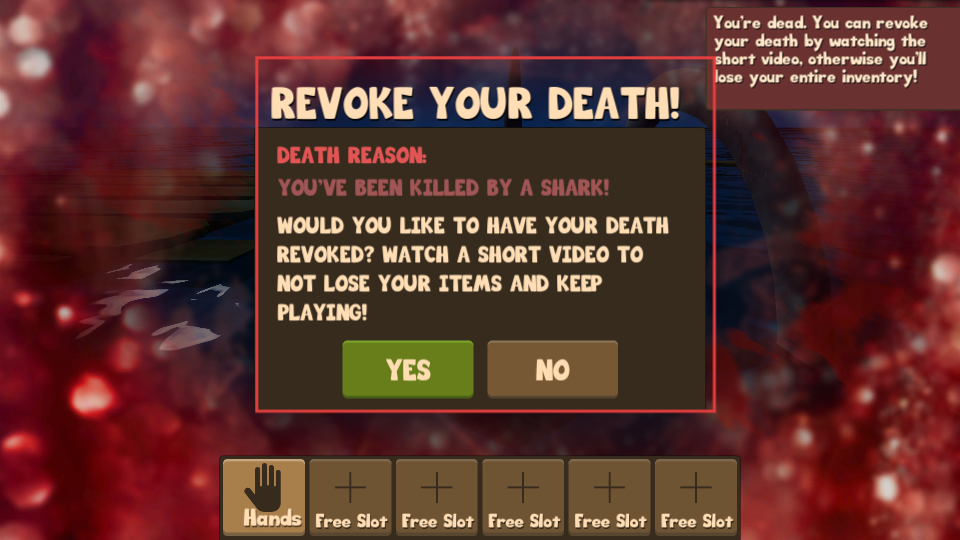 4、若被鯊魚殺死,會出現REVOKE YOUR DEATH提示,可選擇YES觀看短視頻來復活,避免失去物品,繼續游戲。