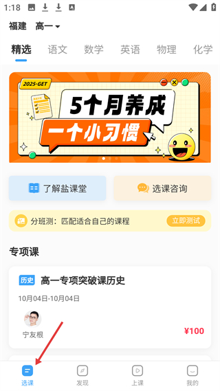 1、選課頁面面向福建高一學生,有精選、語文等學科分類,還有5個月養成一個小習慣的宣傳,以及高一歷史專項突破課等課程。