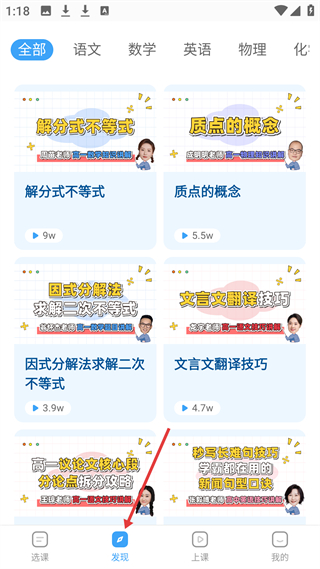 2、點擊發現頁面,展示了眾多九年級課程,涵蓋語文、數學等學科,課程標題醒目,如函數中的存在性問題如何解等,方便學生按需選擇。