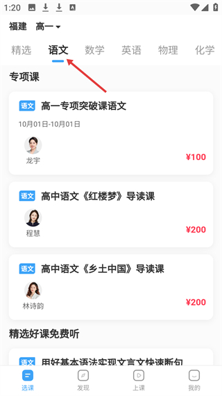 4、語文板塊有高一語文專項突破課、紅樓夢導讀課等,部分課程需付費,也有精選好課可免費收聽。
