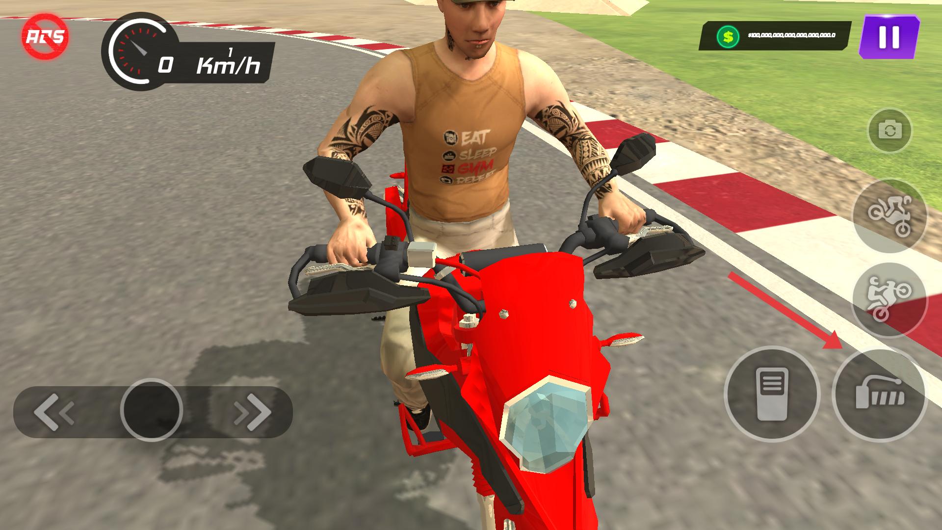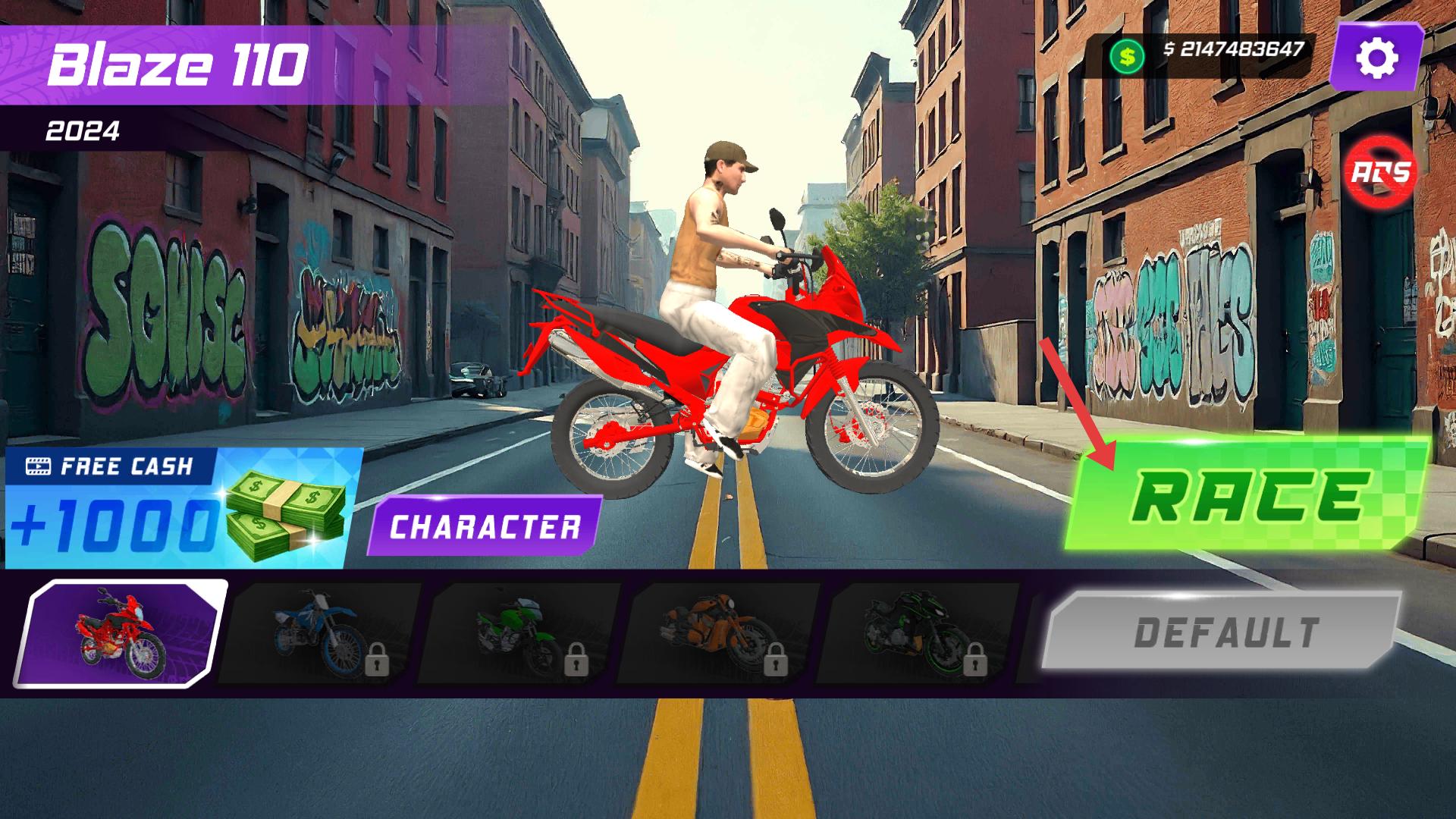 1、在游戲初始界面,選擇好摩托車后,點擊綠色的RACE按鈕,即可進入比賽,開啟摩托車競速挑戰,準備在賽道上馳騁。