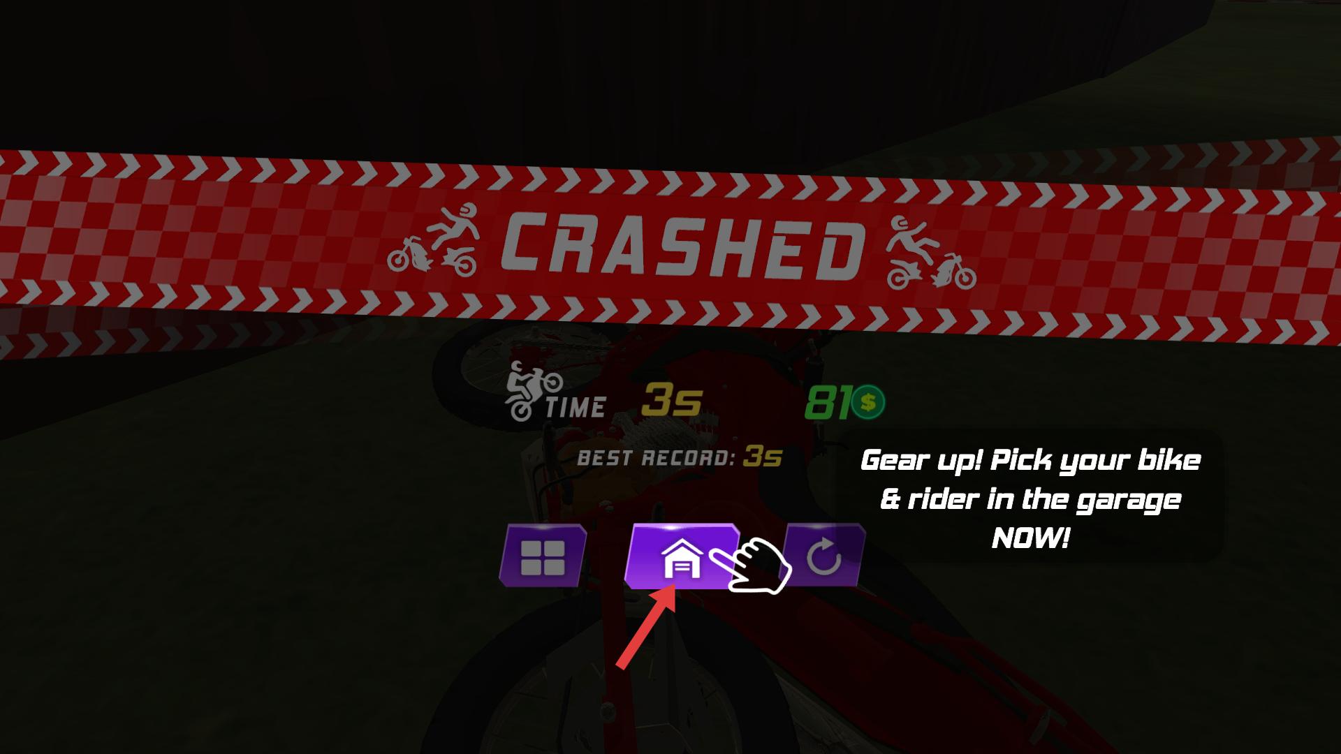 4、若摩托車發生碰撞顯示CRASHED,可點擊房屋形狀的按鈕,回到車庫界面,重新挑選摩托車和騎手,再次挑戰賽道。