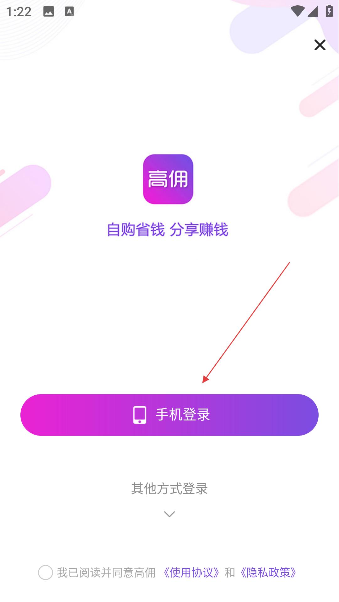 2、登錄頁面選擇【手機登錄】或其他方式,確認協議后登錄,開啟省錢賺錢服務。