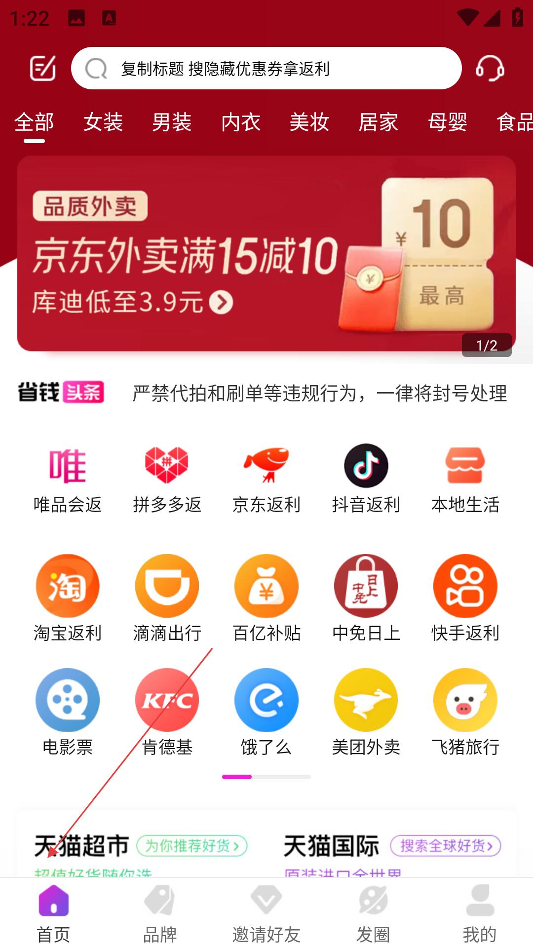 3、主界面查看品質外賣優惠、各類返利入口,通過底部導航首頁、品牌等,體驗省錢賺錢服務。