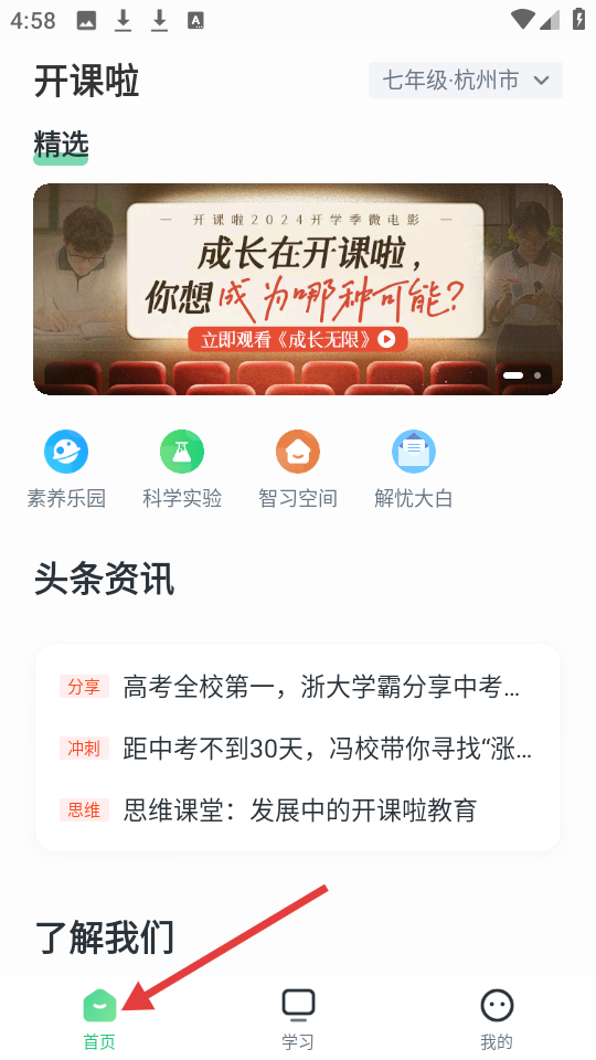 3、首頁以七年級杭州市為定位,含精選內容,推開學季微電影,設素養樂園等功能區,更新頭條資訊豐富學習體驗。
