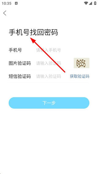 4、若忘記密碼可進入手機號找回密碼界面,輸入手機號、圖片驗證碼和短信驗證碼,點擊下一步即可重置密碼。