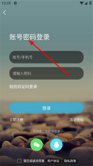 3、賬號登錄選擇界面可選擇賬號密碼登錄,輸入賬號、手機號和密碼,勾選用戶協議和隱私政策后點擊登錄,也可選擇短信驗證碼登錄或微信、QQ等第三方賬號登錄。