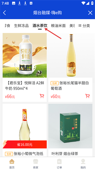 3、嗨e購酒水茶飲分類頁,展示君樂寶鮮牛奶、張裕葡萄酒、煙臺綠茶等商品,可查看價格并加入購物車。