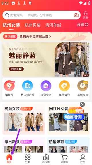 1、首頁,有搜索欄,展示杭州女裝等分類入口及銷量榜等功能入口,還有杭派女裝等板塊,助力查找服裝批發貨源。