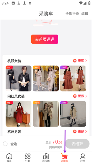 4、采購車板塊,展示杭派女裝、網紅風女裝等推薦商品,用戶可將選好的批發商品加入采購車,方便后續結算采購。