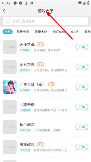 3、進入游戲大廳界面,可搜索游戲名稱,篩選經典卡牌、傳奇大作等分類游戲,如天使之戰、斗羅大陸等,點擊開始即可游玩。