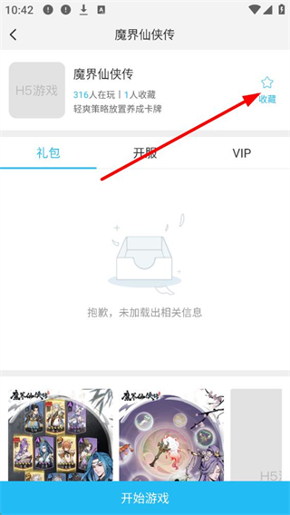 2、魔界仙俠傳詳情界面,可查看游戲玩人數、收藏數,點擊收藏將游戲加入收藏夾,還能查看禮包、開服、VIP信息,點擊開始游戲進入游玩。