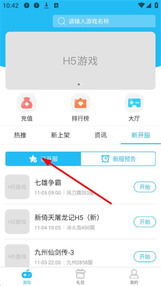 4、新開服界面,可查看已開服和新服預告的游戲,如七雄爭霸、新倚天屠龍記H5等,了解開服時間和服務器信息,點擊開始進入游戲。