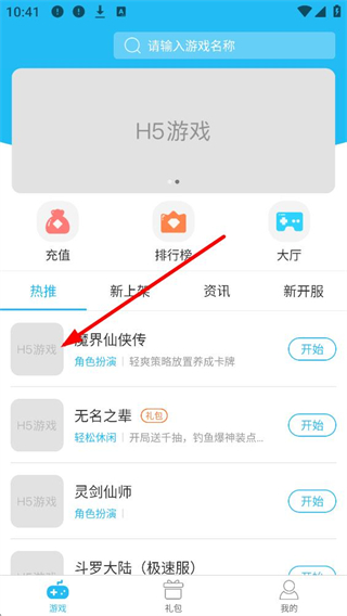 1、進入游戲界面,可搜索游戲名稱,查看H5游戲推薦,熱推分類中選擇魔界仙俠傳等游戲,點擊開始即可游玩。