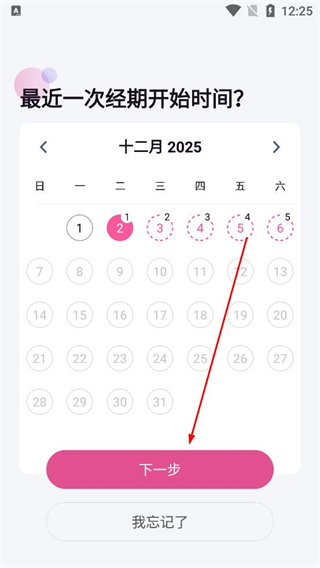 4、選擇最近一次經期開始時間,在日歷中選定對應日期,完成選擇后點擊下一步按鈕,若忘記日期可點擊我忘記了選項進行后續。