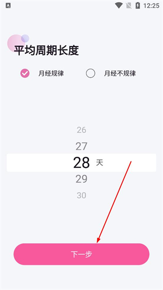 3、設置平均周期長度先選擇月經規律或月經不規律選項,再選定對應的周期天數,確認后點擊下一步按鈕,進入下一項信息填寫。