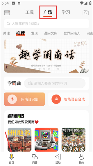 2、進入廣場頁面,能看到搜索欄,還有字詞典工具,閩南話識別智能語音合成功能,同時有編輯精選的內容板塊,可利用這些功能或瀏覽內容來接觸閩南話。