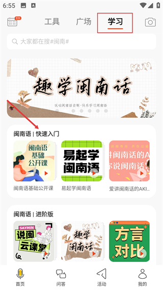 3、切換到學習頁面,可看到閩南語快速入門和進階版的課程分類,每個分類下有對應的課程內容,選擇任意課程就能進入該課程的詳情頁面。