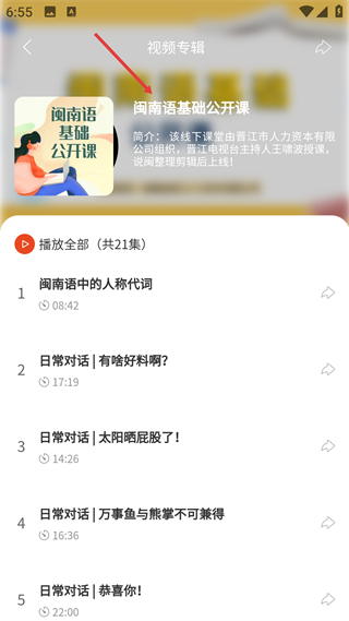 4、進入閩南語基礎公開課的視頻專輯頁面,能看到播放全部選項,還有多集細分的學習內容,可選擇播放全部或單集內容來進行閩南話的學習。