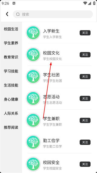 2、在學生知識庫頁面選擇校園文化分類,查看入學新生學生社團等相關內容條目,找到感興趣的校園文化內容準備查看詳情。