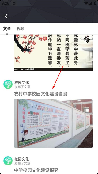 3、點擊校園文化下的文章條目,進入文章列表頁面,瀏覽農村中學校園文化建設等文章,選擇目標文章查看具體內容。