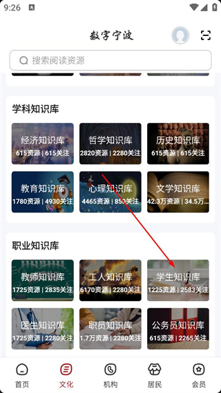 1、打開數字寧波app進入文化頁面,瀏覽學科知識庫職業知識庫等板塊,找到學生知識庫選項并點擊,進入學生相關內容頁面。