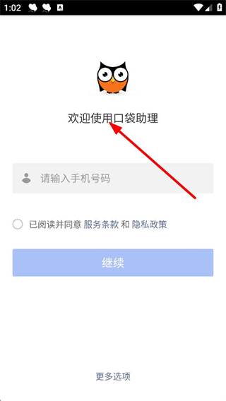 1、進入口袋助理登錄界面,輸入手機號碼,勾選已閱讀并同意服務條款和隱私政策后點擊繼續,開始注冊流程。
