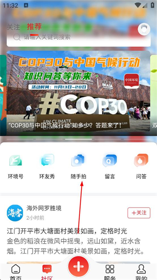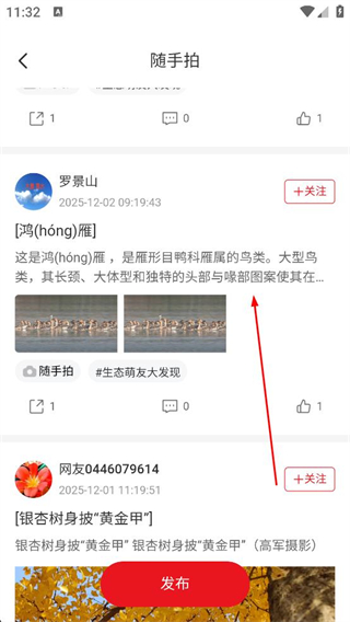3、在隨手拍頁面瀏覽其他用戶發布的內容,包括各類生態相關分享,若有創作需求,可編輯內容并點擊發布按鈕,分享自己的隨手拍內容。