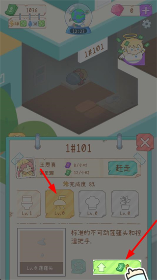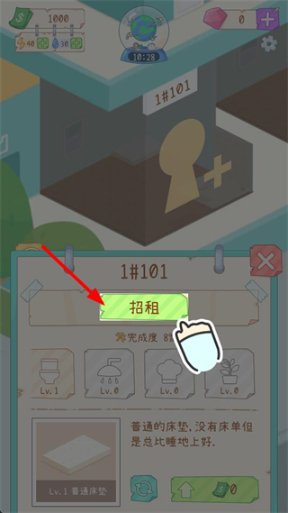 4、租客入駐后,可查看房間的設施完成度,點擊對應設施的升級按鈕,提升設施等級,優化租客居住條件,增加收益。